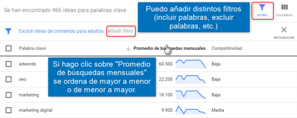 Por ejemplo, si quisiéramos ver las palabras que tienen más búsquedas haríamos clic sobre «Promedio de Búsquedas mensuales».
