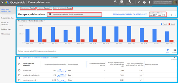 Nuestro propósito es buscar ideas de palabras clave para ambos términos (consultor de marketing digital y consultor seo) con datos almacenados por Google en el último año.